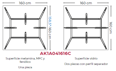 Mesa para sala de reuniones de diseño arquitectónico con estructura de aluminio en 6 acabados y superficie de melamina en 6 acabados de 160, 240 o 320 cm de ancho, 160 de fondo y 74 de alto