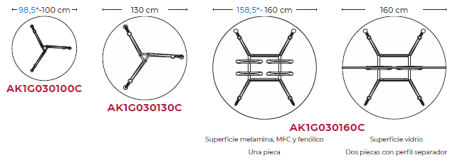 Mesa redonda de centro de diseño arquitectónico con estructura de aluminio en 6 acabados y superficie redonda de melamina en 6 acabados de 100, 130 o 160 cm de diámetro y 74 de alto