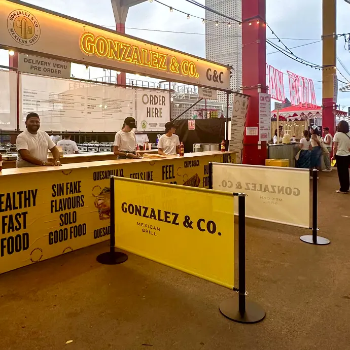 La lona es personalizable, lo que la convierte en un elemento tanto de separación como publicitario. Recomendamos elegir un diseño atractivo para promocionar tu evento, marca o producto.